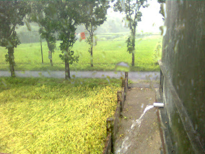 Ternyata hujan memang benar-benar sering melanda kami (manusia di Sleman) dengan waktu yang sangat tepat! Kalau tidak salah ini adalah bulan oktober, bulan untuk memanen padi-padi yang telah menguning. Kalau saja hujan tak datang hari itu, kapankah untuk yang kali pertama aku melihat padi-padi itu tertidur seluruhnya? Sampai-sampai para petani meributkan hal itu (mereka akan benar-benar kesusahan memanen mereka).